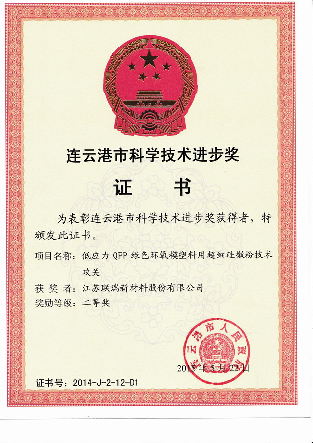 NOVORAY’s “Key project of ultra-fine crystalline silica powder technology for low-stress QFP green epoxy molding compound” won the second prize of Lianyungang Science & Technology Progress.